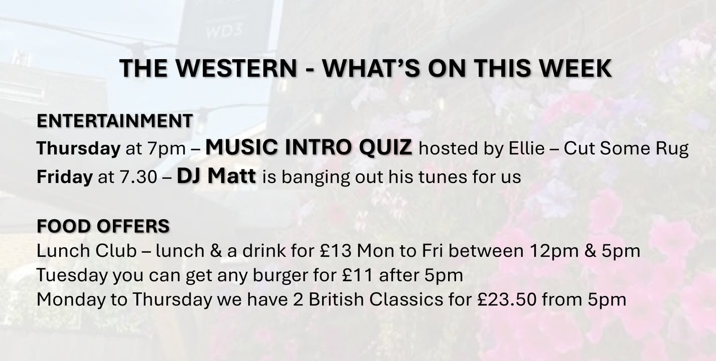 This week's line up @ The Western #rickmansworthpub #rickmansworthhighstreet #rickmansworth #westernwd3 #musicquiz #djnight #BurgerTime